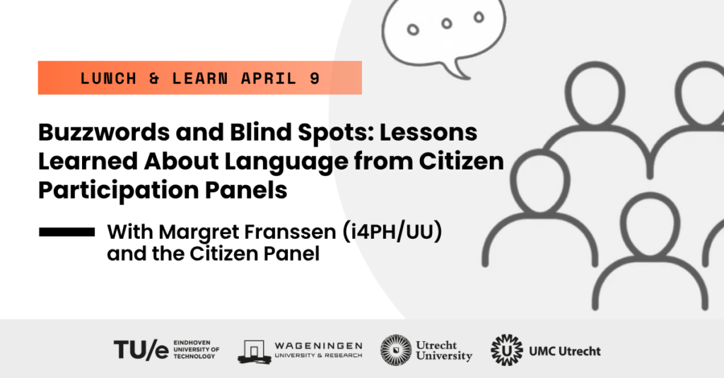 Margret Franssen (EWUU institute 4 Preventive Health / Utrecht University) will share insights from ongoing work with citizen participation panels in Utrecht, Wageningen and Eindhoven. These panels bring together people with lived experience of worries and stress around money, work, housing and health, topics that research often focuses on, but who are not always included in shaping that research. Margret will be joined by a panel member and together they will briefly introduce how the panels are organized and what we learn from working together over time.